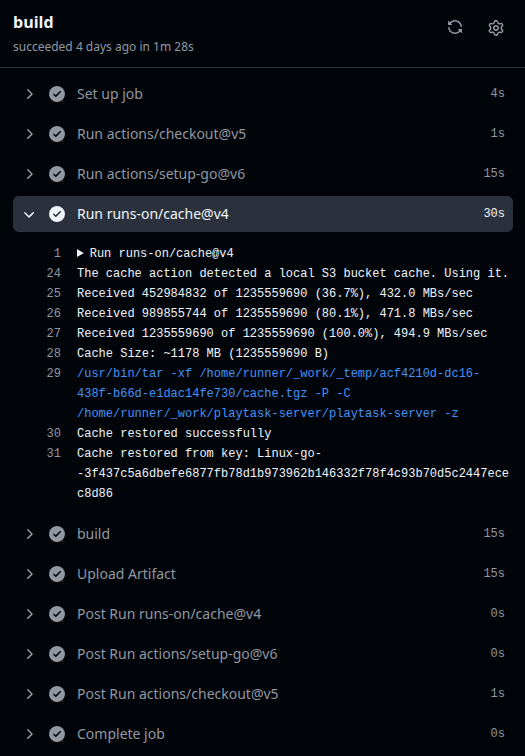 で30秒程度。S3 bucketからキャッシュを取得するのは450MBs/sec前後出ているので、本家のactions/cache